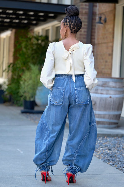 Back Tie Puff Sleeve Contrast Sweater -Cream -FINAL SALE