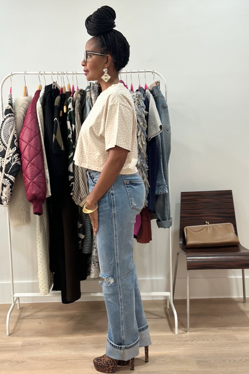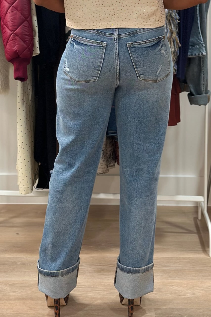 Elevate your denim game with these standout dad jeans that prove retro never goes out of style. The cross waistband and unyielding front deliver that iconic structured silhouette, while concealed stretch in the back keeps comfort in the picture. Cut straight through the leg and topped with a rolled cuff for that deliberate, polished finish—these are jeans built for those who know exactly what they want. Front made of 100% cotton. Back made of 94% cotton, 5% polyester and 1% spandex. Jeans are 45 inches in length and 32 inch inseam.