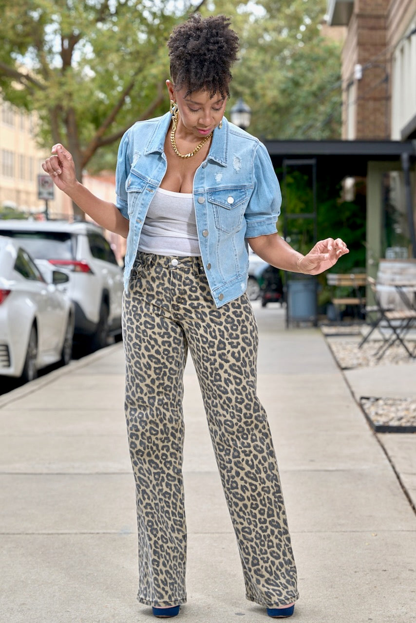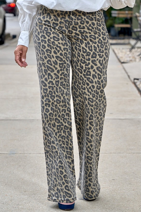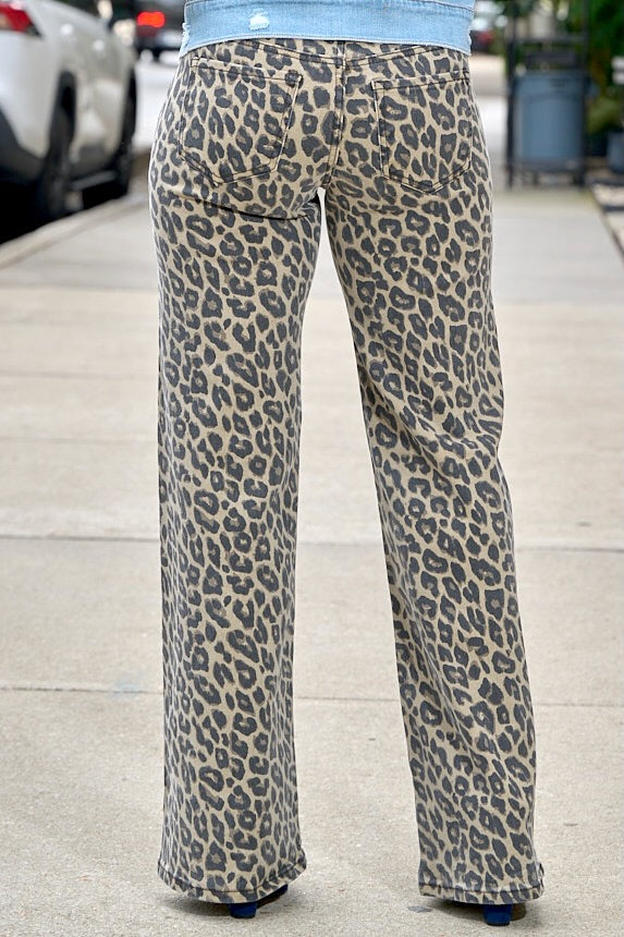 Leopard Mid Rise Wide Leg Jeans (A-11509)