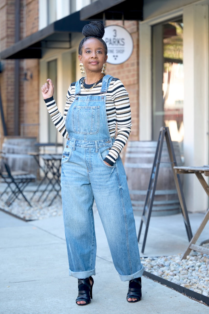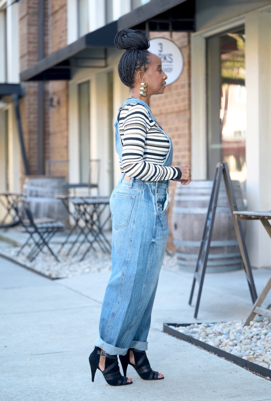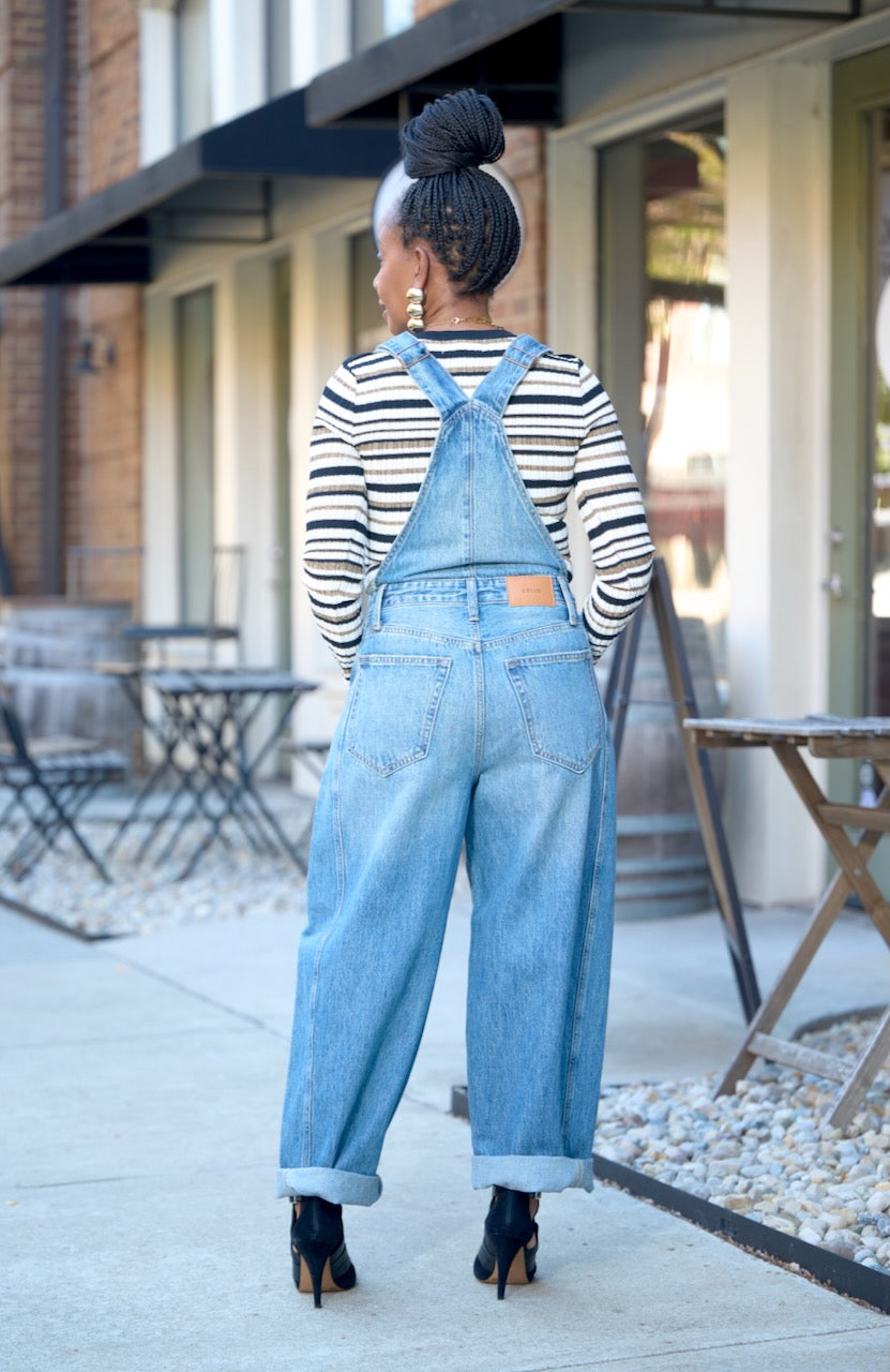 These stylish mid-waist medium denim barrel leg overalls offer a flattering fit and contemporary edge. Made from quality denim, they provide comfort and durability, perfect for elevating your casual wardrobe. Available in sizes XS to XL, they blend classic appeal with modern design for versatile everyday wear. Inseam is 27 inches and a rise of 13 inches.  Made of 100% cotton with NO stretch.