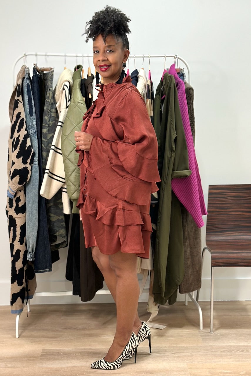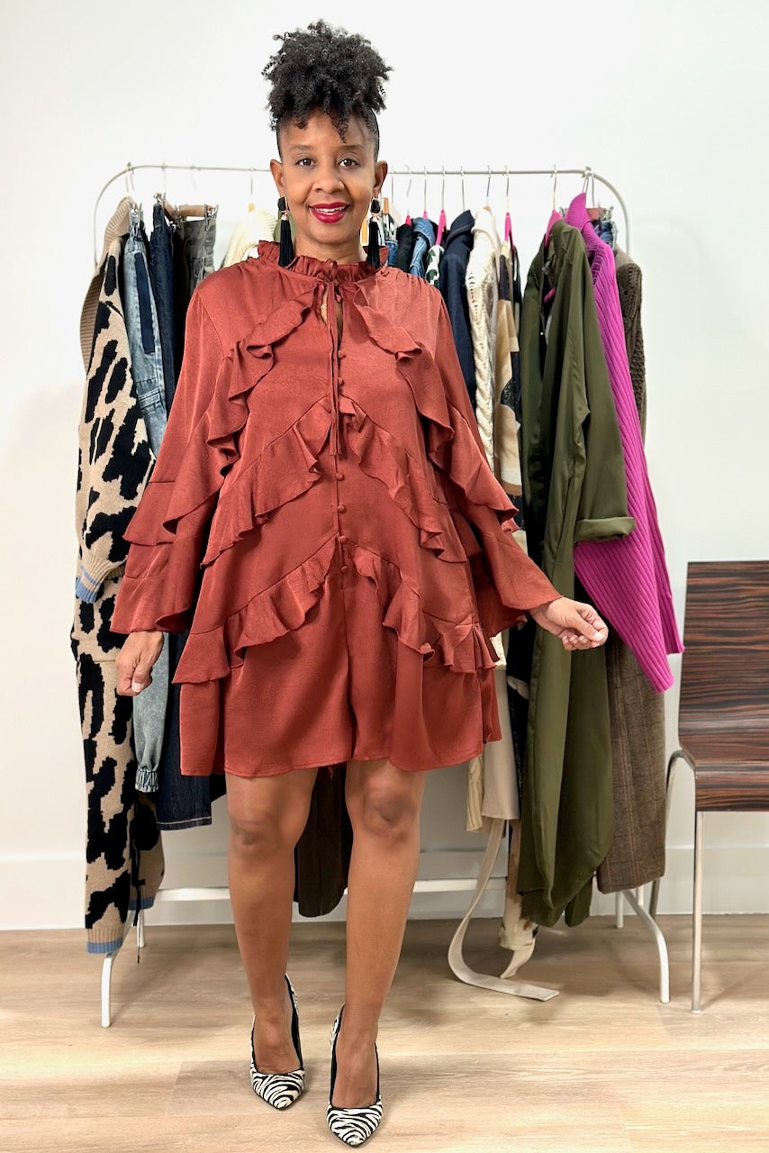 Elevate your look with this satin button-front romper, featuring a striking tiered ruffles and tie neck detail. The smooth satin fabric drapes beautifully while the structured ruffles add dimension and movement. Perfect for date night or upscale casual occasions, this piece transitions effortlessly from day to evening.