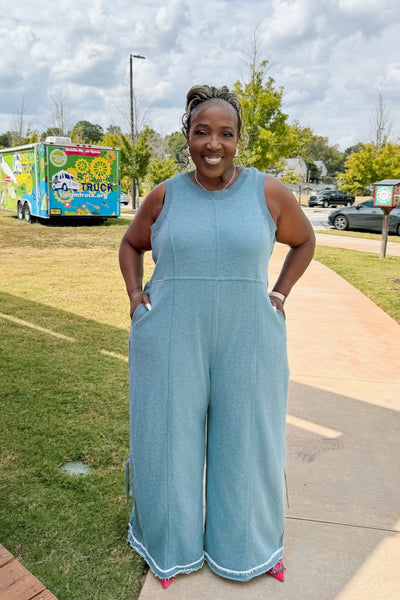 Curvy Ruched Side Seam Racer Back Jumpsuit -Teal