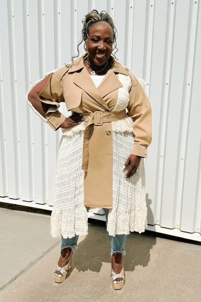 Curvy Slit Sleeve Ruffle Hem Contrast Trench