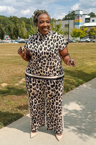 Curvy Knit Leopard Mock Neck Top and Pants Set -Black