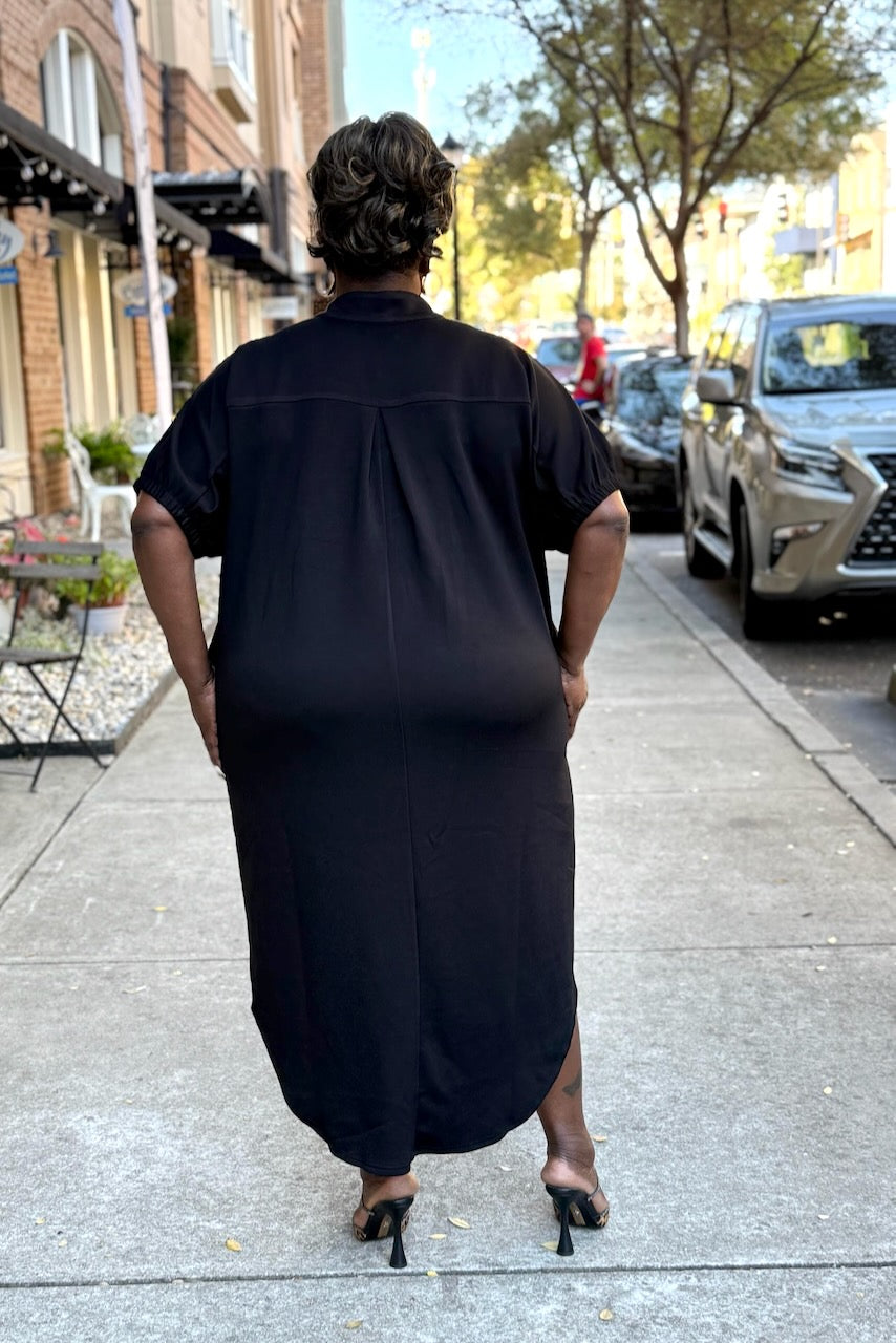 The Curvy V-neck Elastic Sleeve Midi Dress in black offers a perfect blend of comfort and style. Featuring a flattering V-neck and elasticized sleeves for a flexible fit. This midi dress drapes beautifully for a chic silhouette. Practical side pockets add convenience without sacrificing elegance, making it an ideal choice for effortlessly polished looks any day of the week. Style with flats, heels or sneakers.