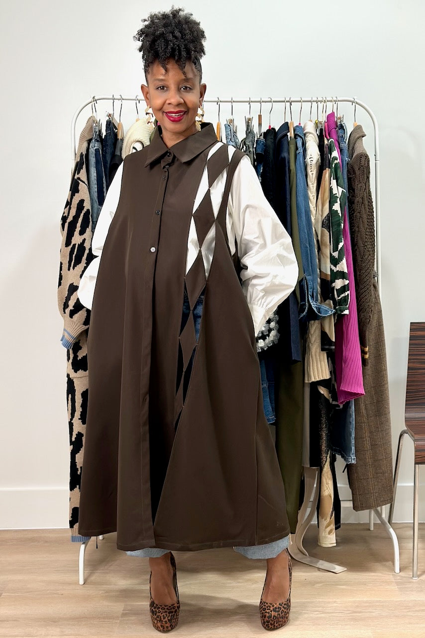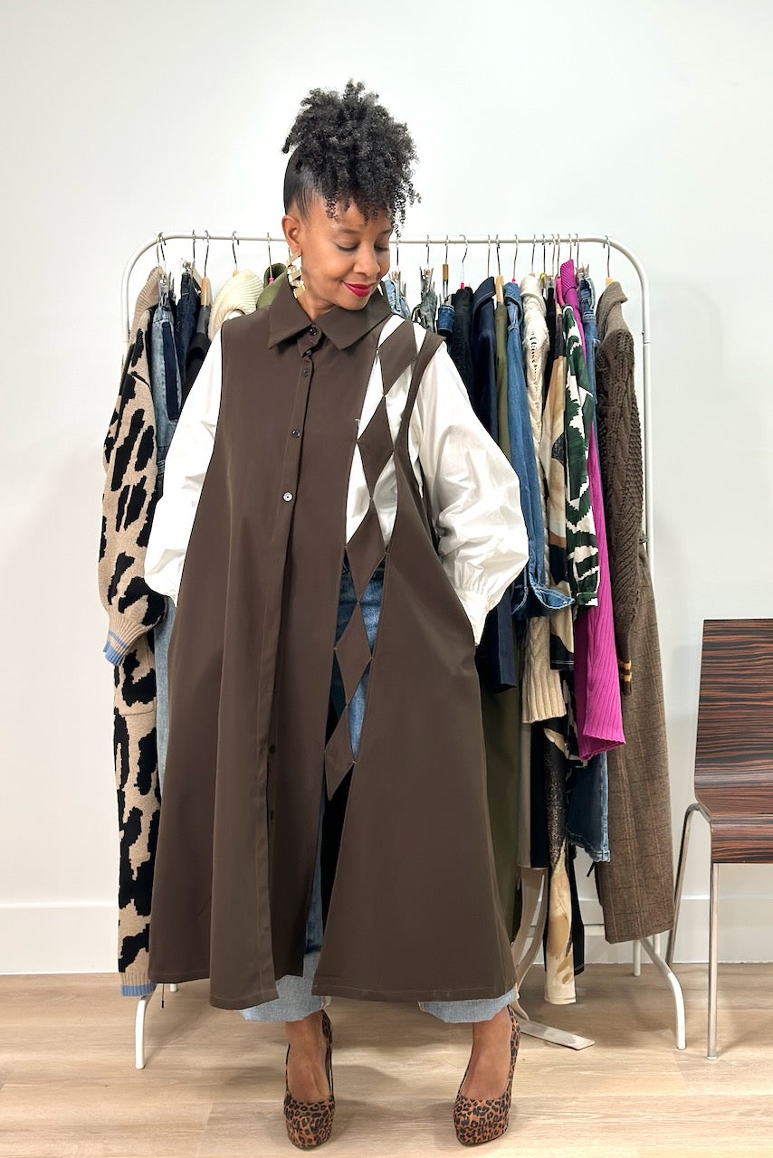 This brown tunic dress combines chic style with smart design. Diamond cut-outs create an eye-catching detail across the front, while hidden pockets add practical appeal. The relaxed fit works beautifully layered or worn alone—a versatile wardrobe essential for any season. Endless Styling possibilities with this piece. Style one denim, liquid legging with a nice long sleeve top. Wear it as a dress, long vest or tunic. It has a flared a-line fit and midi length. Made of polyester material with no stretch.