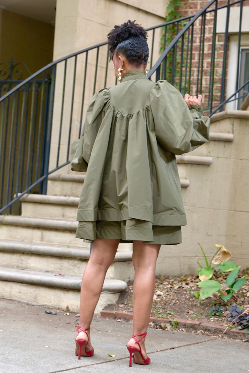 This stylish Lace Mock Neck Mini Dress in olive combines elegant design with playful details. It features a double-layer hem that adds dimension and movement, while the bubble sleeves provide a trendy, voluminous silhouette. The lace trim mock neck offers a chic, refined touch, making this dress perfect for any occasion where you want to stand out with effortless sophistication. Made of polyester material with no stretch.