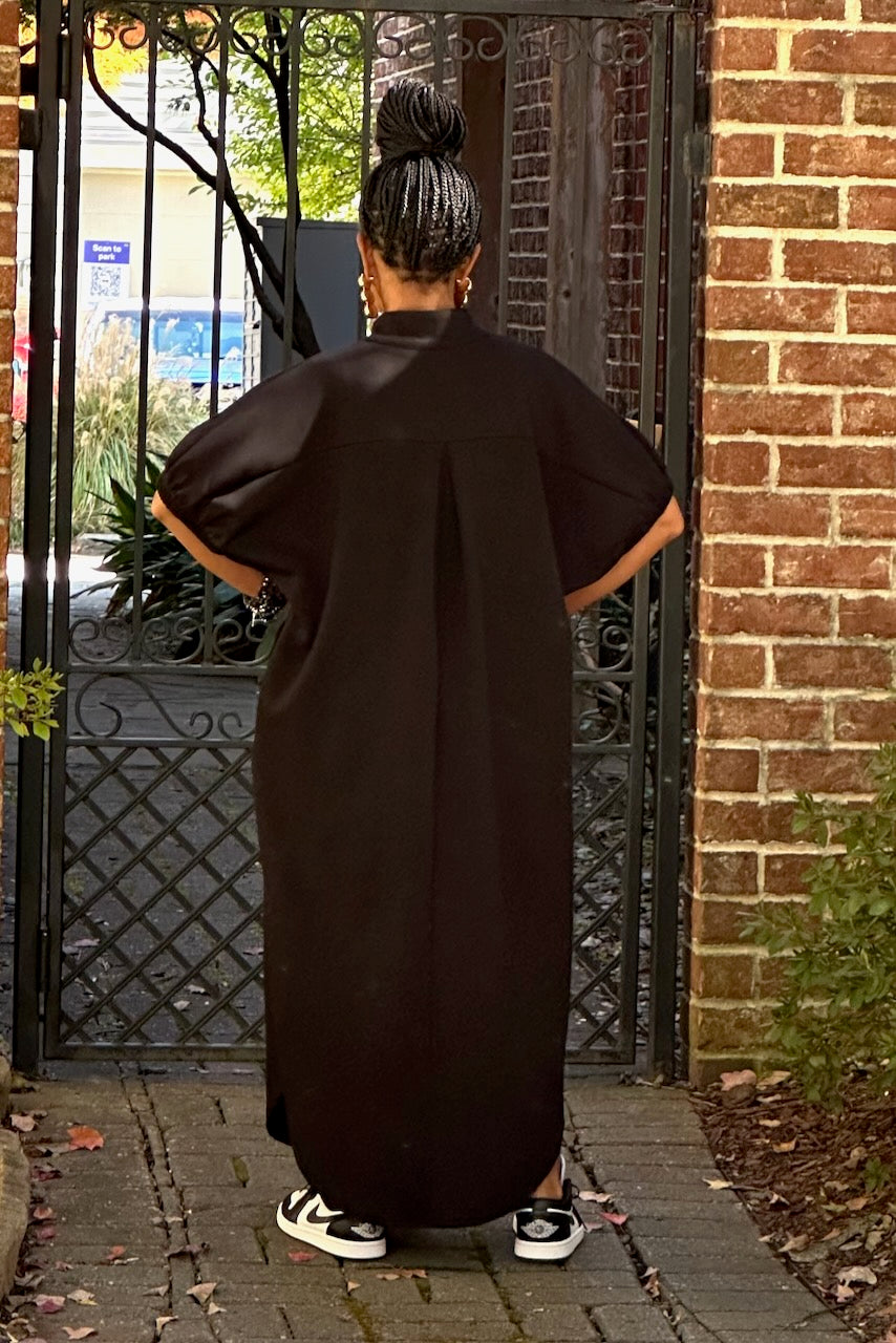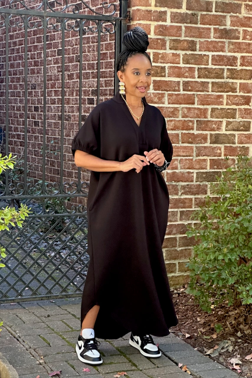 The Curvy V-neck Elastic Sleeve Midi Dress in black offers a perfect blend of comfort and style. Featuring a flattering V-neck and elasticized sleeves for a flexible fit. This midi dress drapes beautifully for a chic silhouette. Practical side pockets add convenience without sacrificing elegance, making it an ideal choice for effortlessly polished looks any day of the week. Style with flats, heels or sneakers.