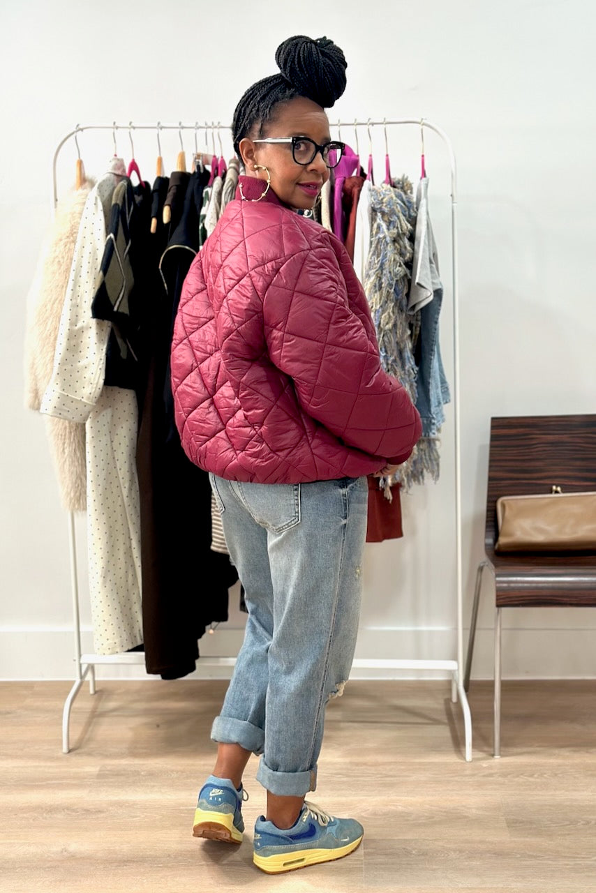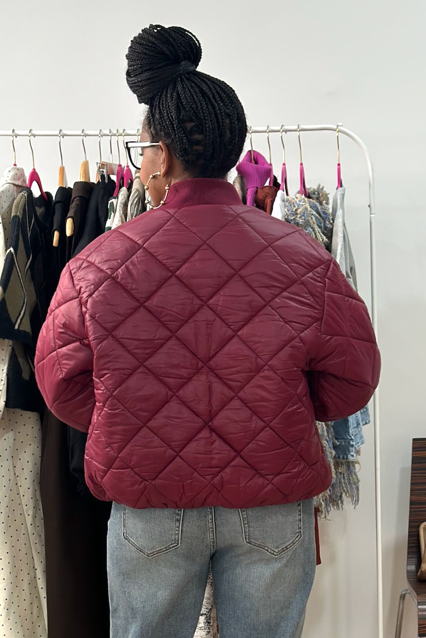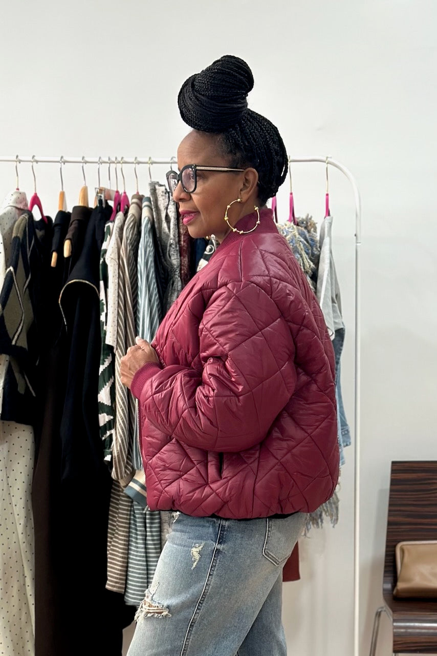 Cute Quilted Bomber Jacket- Burgundy (A-11664)