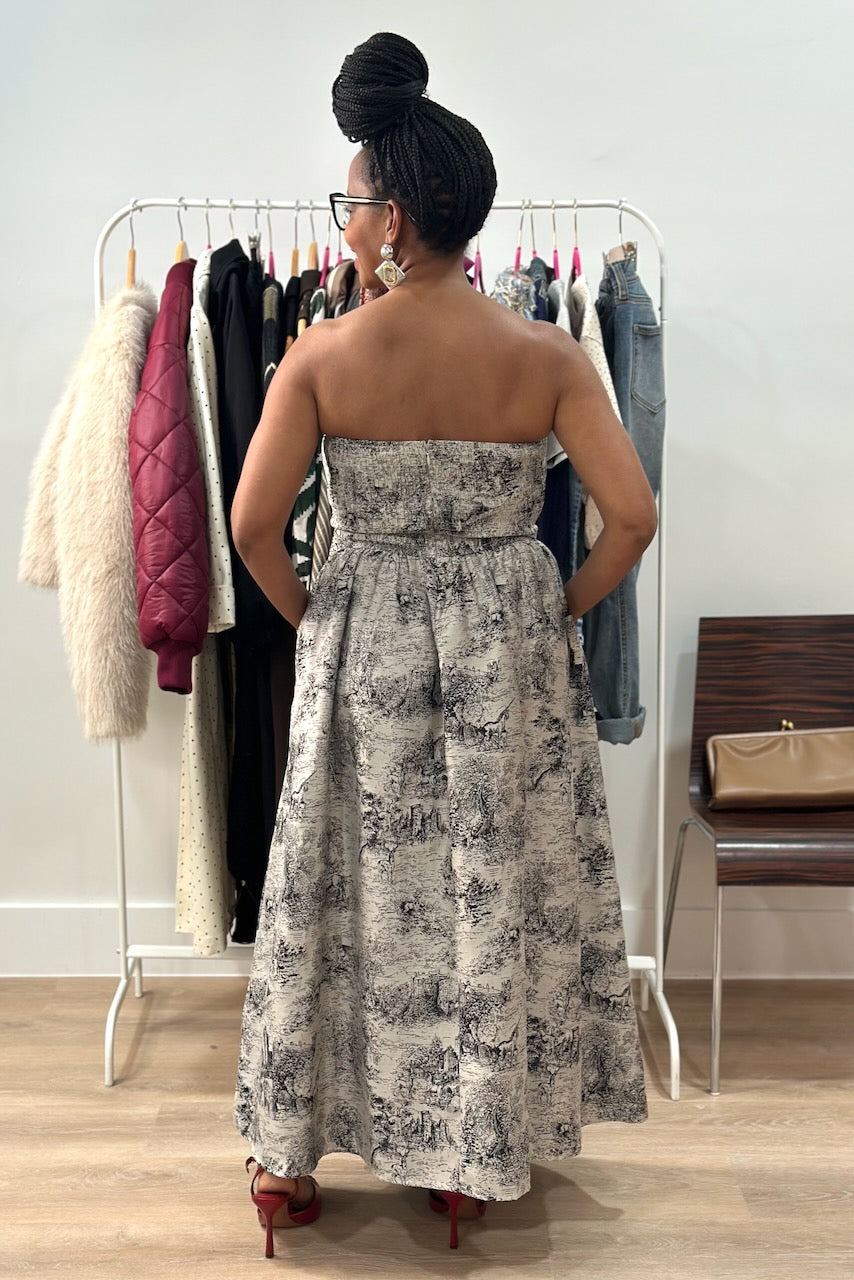 Strapless Pleat Front Toile Print Midi Dress- Taupe