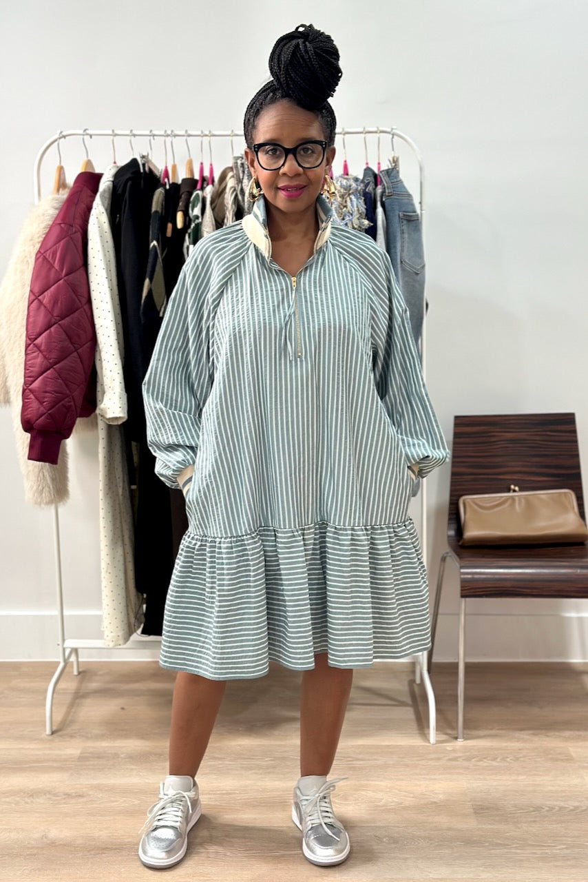 Regular price $ 78.00 Save $ -78.00Stripe Band Pinstripe Long Sleeve Mini Dress-Teal (A-11630T)