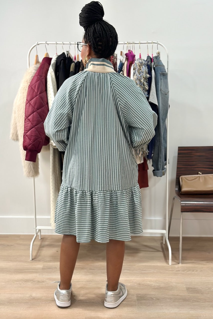 Stripe Band Pinstripe Long Sleeve Mini Dress-Teal