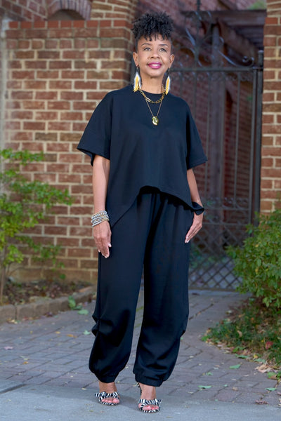Boxy Crewneck Top & Pleat Leg Jogger Set- Black