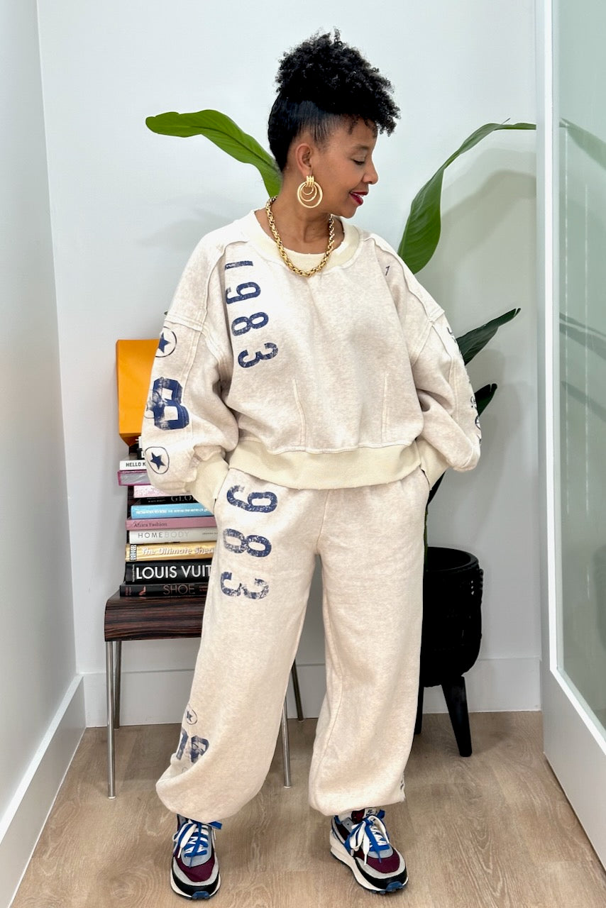 Two-piece jogger set with "1983" and "New York" lettering down the sides. The washed finish gives it that coveted vintage vibe. Comfortable, stylish, and unapologetically chic. Pieces look great styled separately. Made of 65% polyester and 35% cotton.