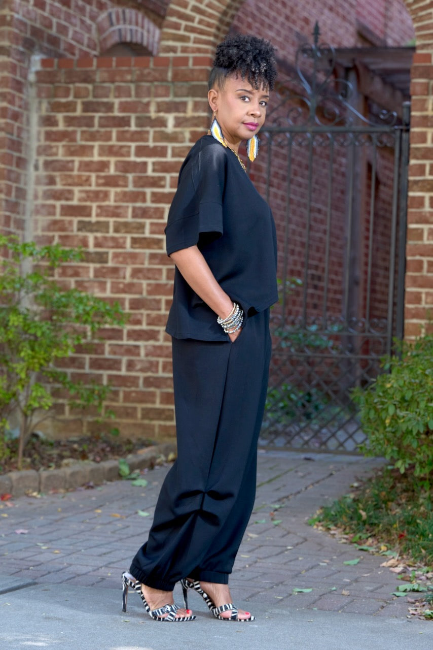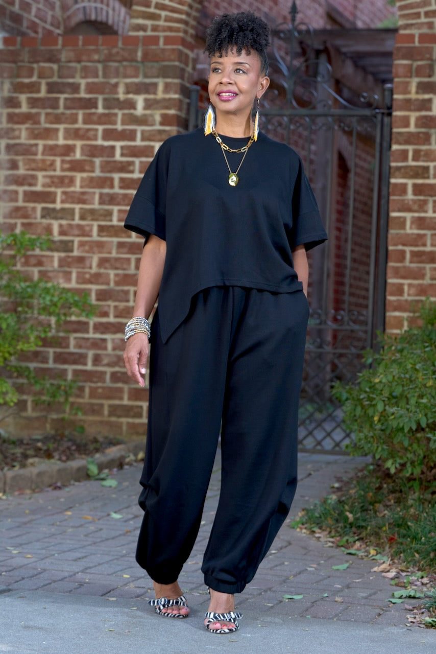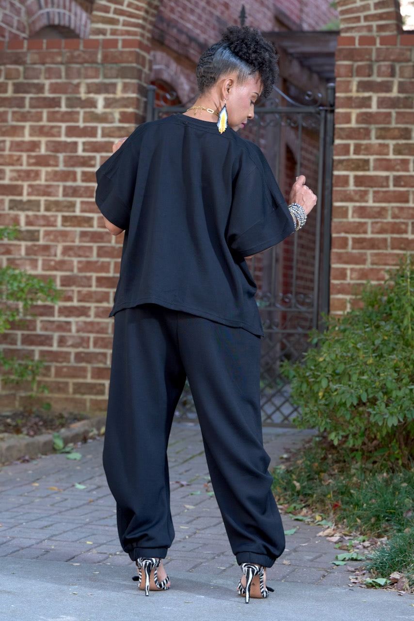 Regular price $ 85.00 Save $ -85.00Boxy Crewneck Top & Pleat Leg Jogger Set- Black (A-11551BK)