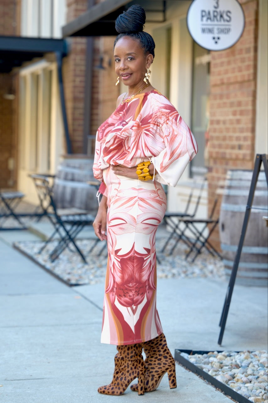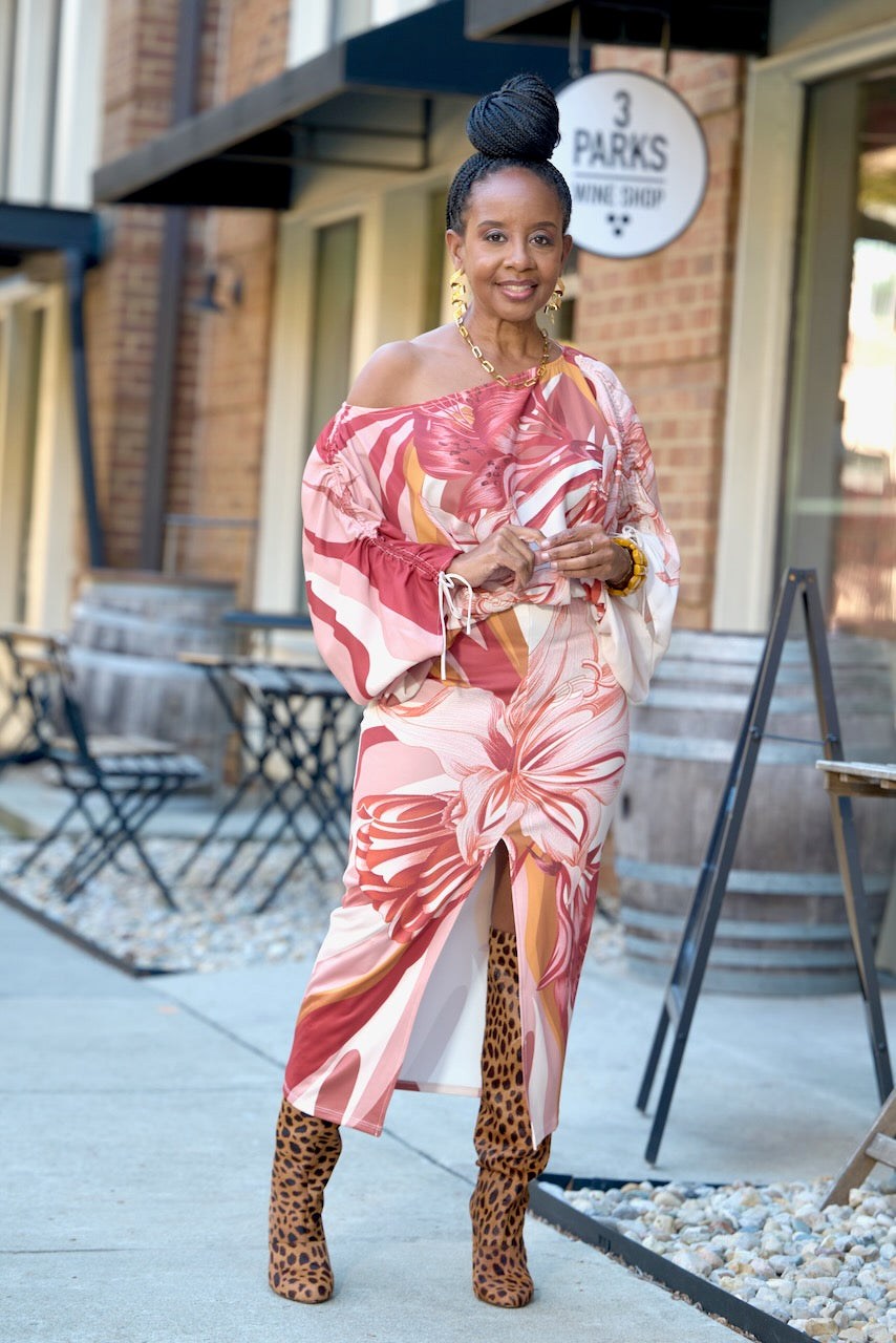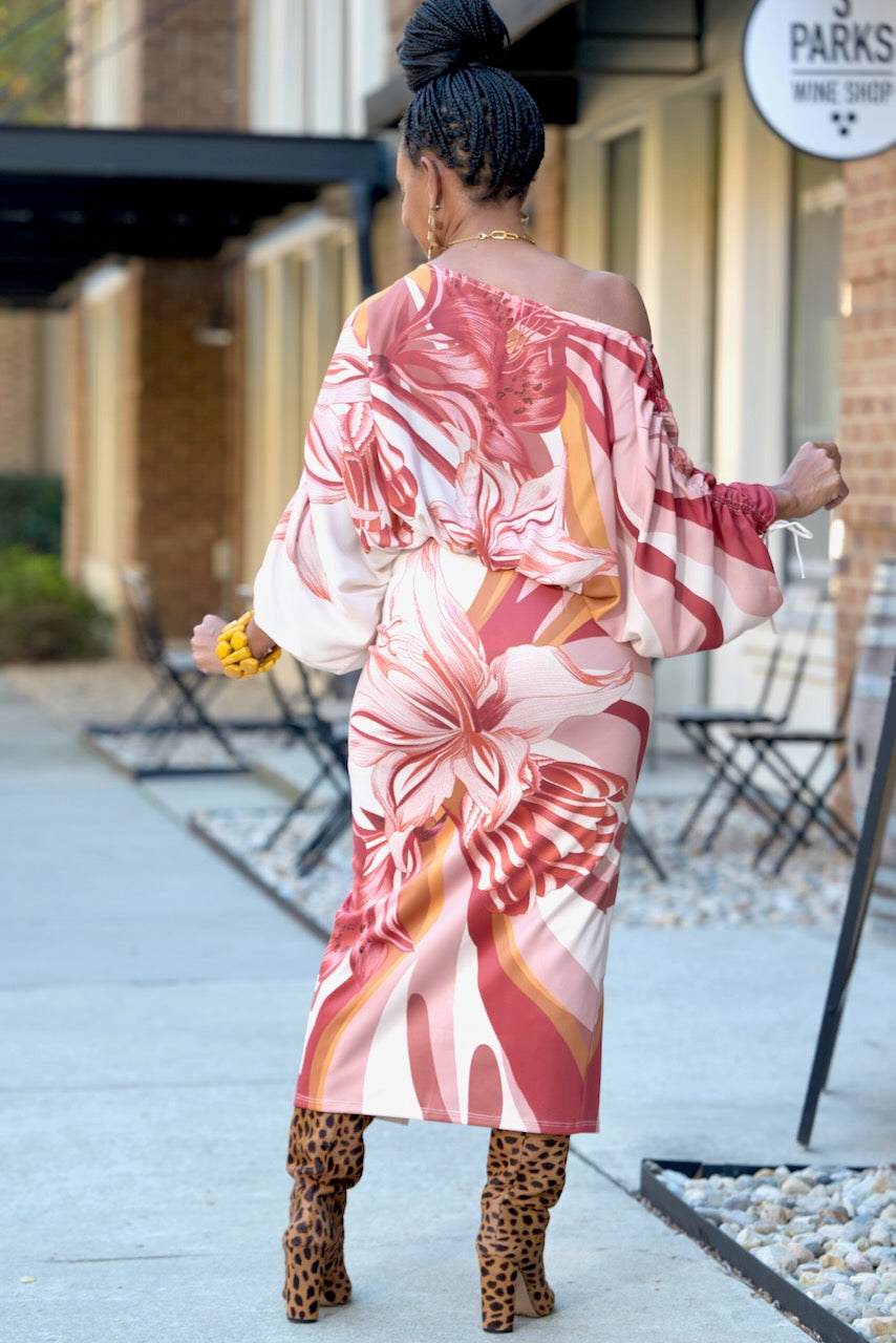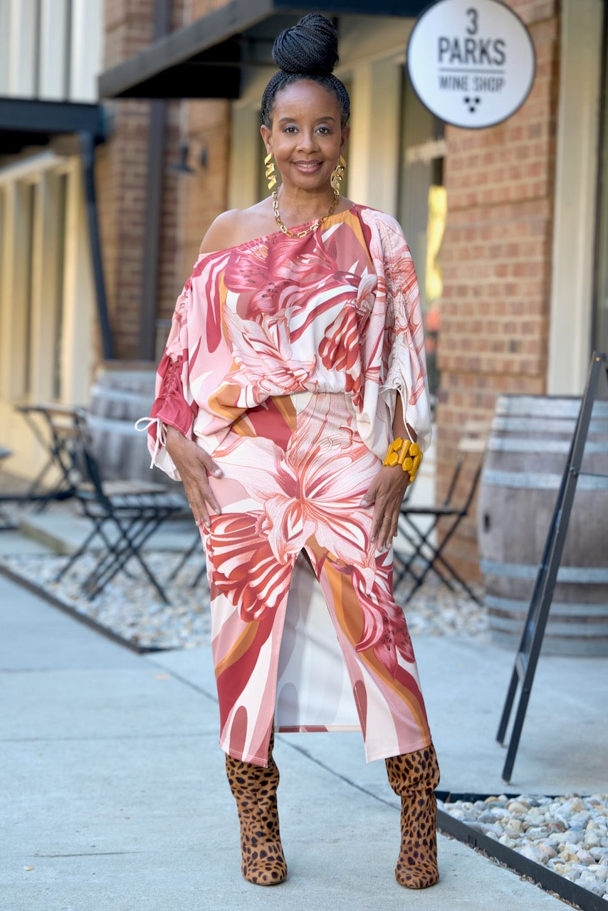 Make a statement with this coordinated set featuring a cropped dolman top showcasing autumn florals and a sleek front-split pencil skirt. The draw shoulder design and flowing sleeves offer effortless elegance, while the tailored skirt ensures a polished finish. Perfect for layering or wearing solo, this pairing delivers modern style with timeless appeal.