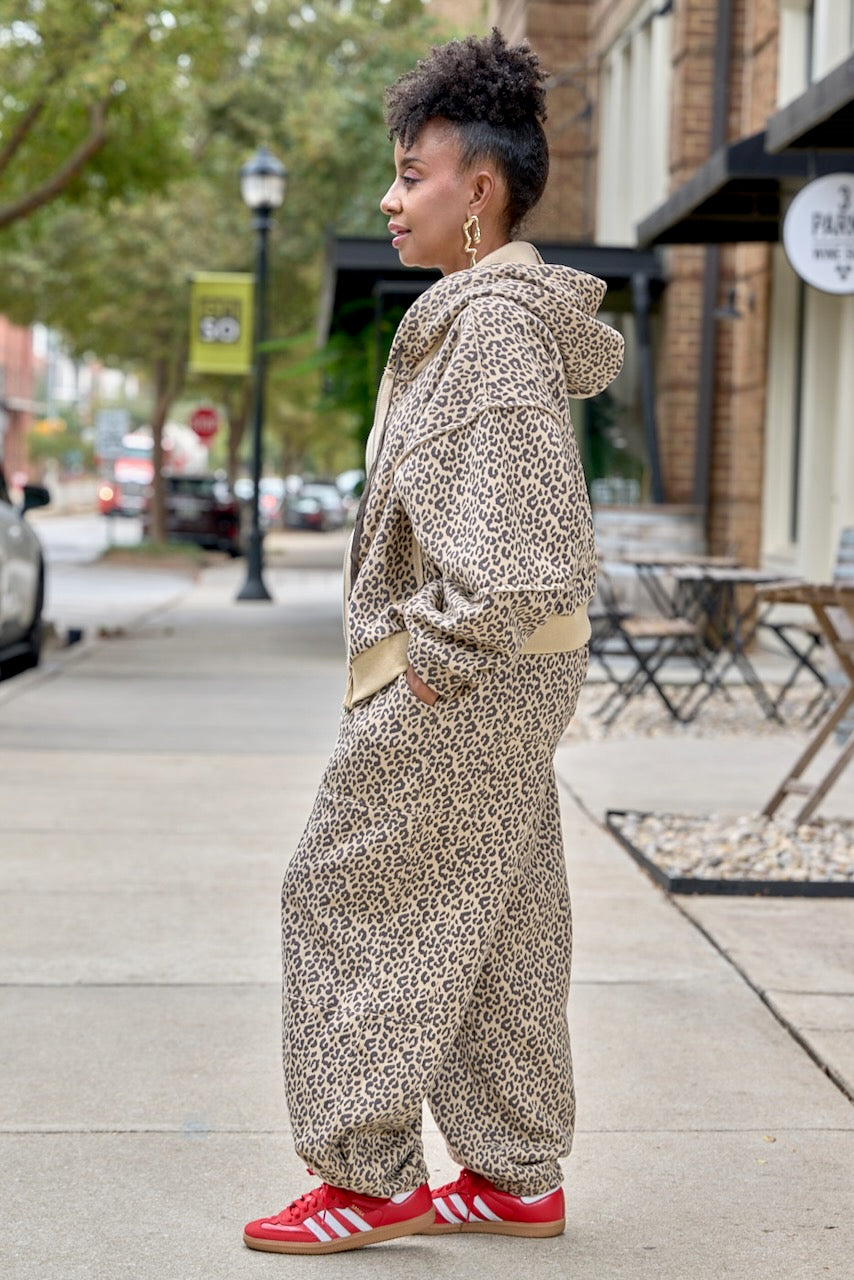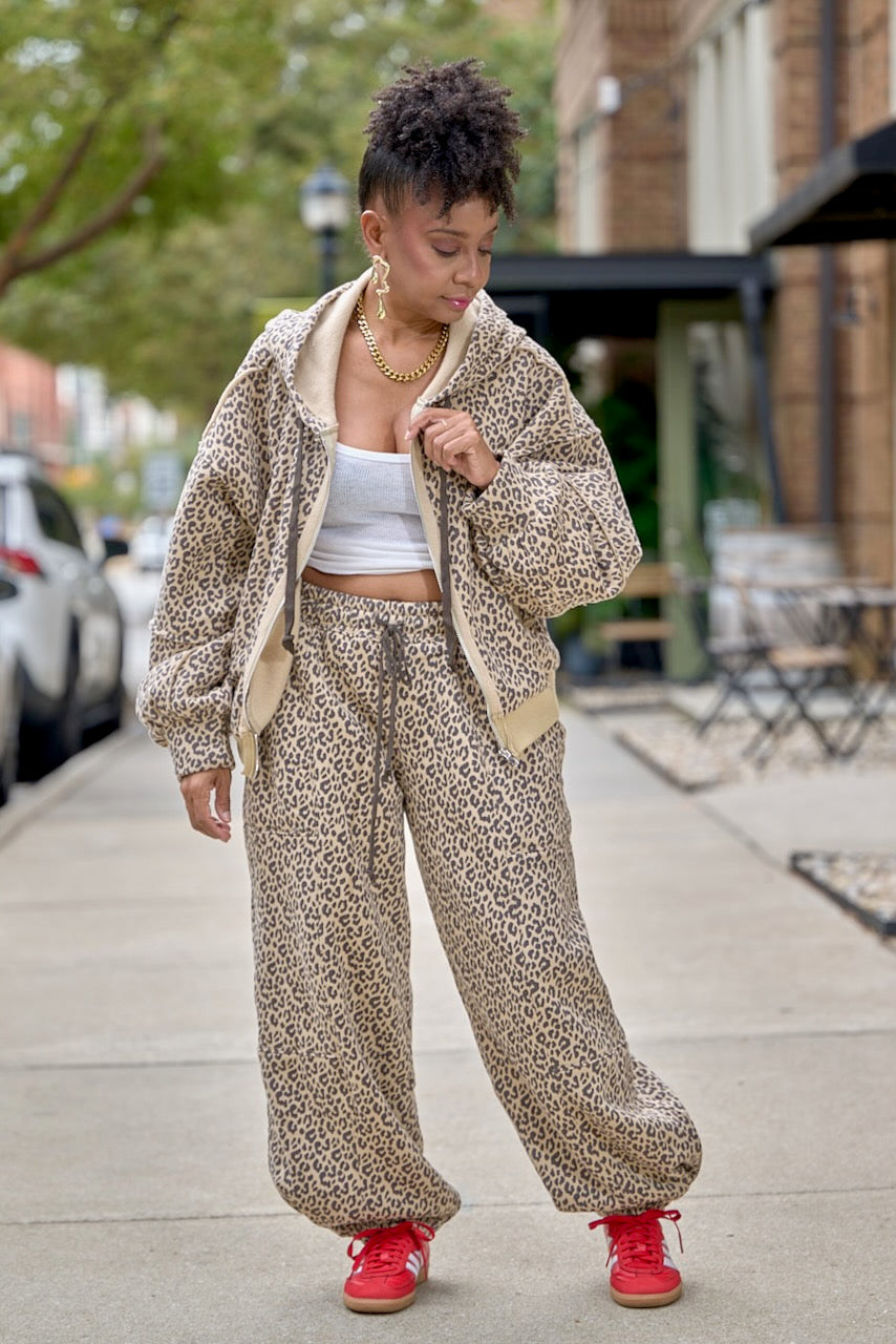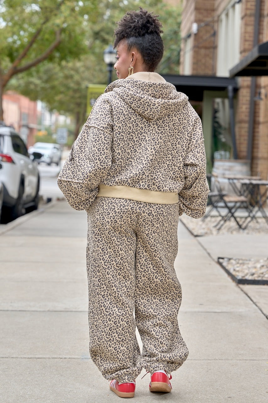 Elevate your wardrobe with the Leopard Contrast Rib Jogger Set featuring a sleek zip-front hoodie jacket and matching joggers. The striking leopard print paired with contrasting ribbed trim adds a stylish edge, while the comfortable fit ensures effortless wear throughout the day. Perfect for lounging, travel or on-the-go looks.