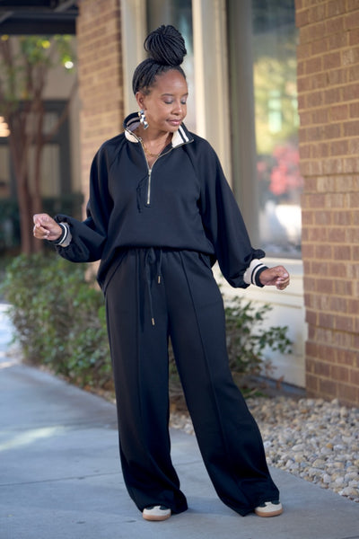 Stripe Collar & Cuff Wide Leg Jogger Set -Black
