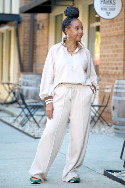 Stripe Collar & Cuff Wide Leg Jogger Set- Almond