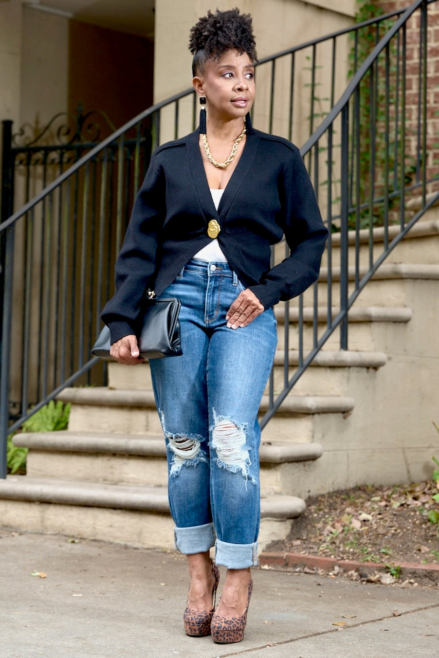 Gold Accent Deep V Ribbed Cardigan -Black